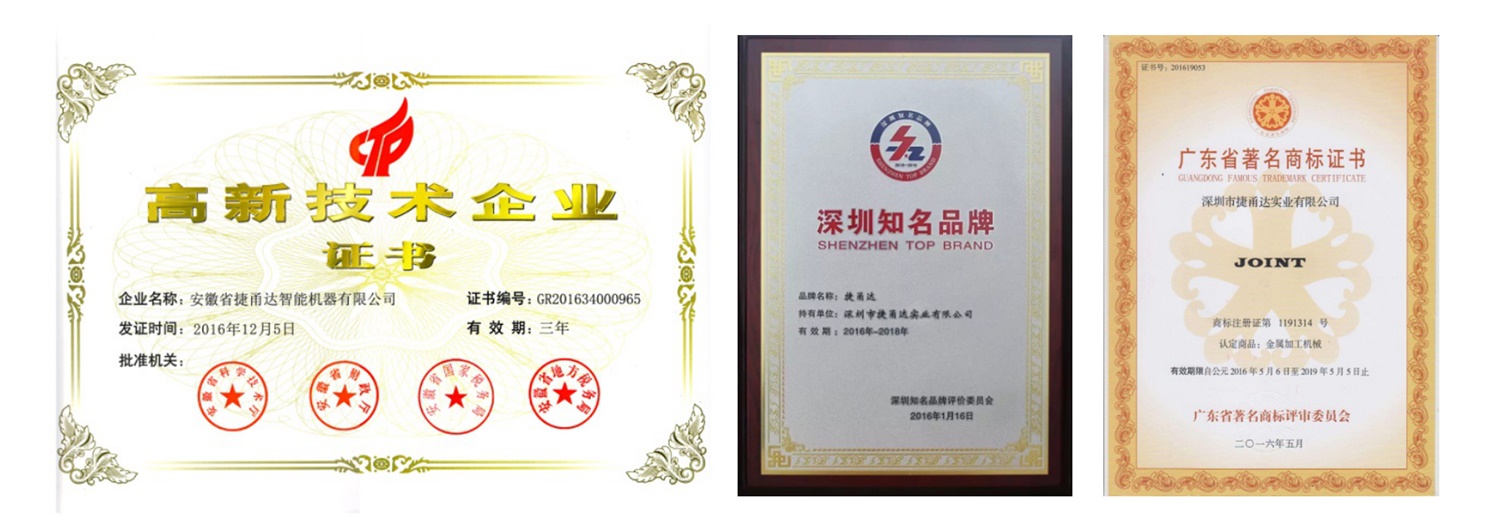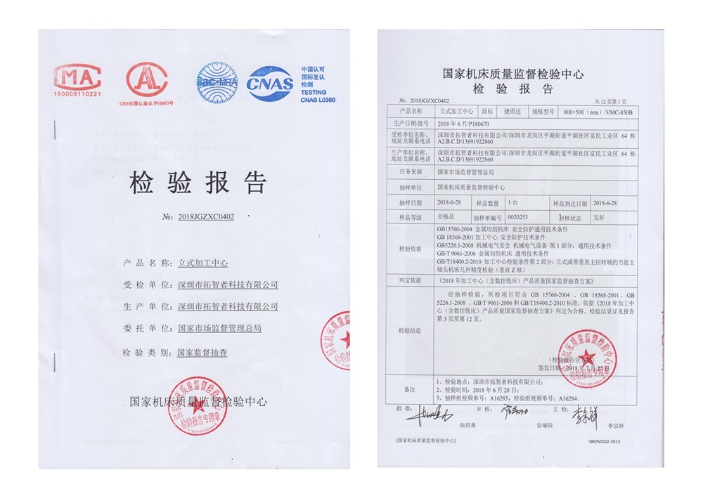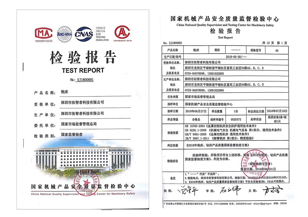 深圳市拓智者科技有限公司產(chǎn)品連續(xù)多年順利通過了國家市場監(jiān)督管理總局、國家質(zhì)量監(jiān)督檢疫總局質(zhì)量檢測并出具頒發(fā)權(quán)威的質(zhì)量檢驗報告, 表明捷甬達(dá)機床的質(zhì)量制度、質(zhì)量保證能力等得到國家認(rèn)證機構(gòu)的認(rèn)可。