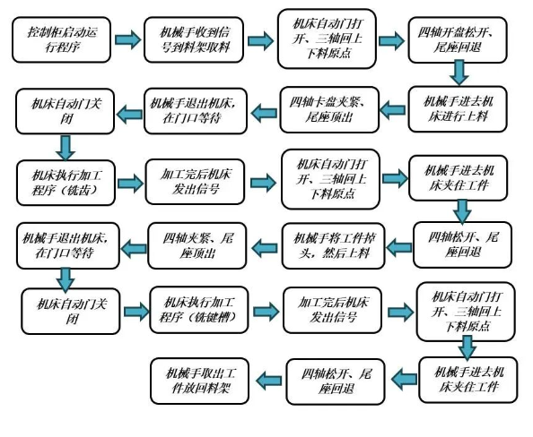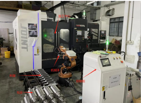 自動(dòng)化產(chǎn)線的上下料過(guò)程非常簡(jiǎn)單且高效。工人只需將毛坯放在料架上,啟動(dòng)產(chǎn)線自動(dòng)程序后,六關(guān)節(jié)機(jī)械手便會(huì)自動(dòng)抓取毛坯并將其送入加工中心進(jìn)行加工。加工完成后,機(jī)械手再將成品取出并放置在指定位置。整個(gè)過(guò)程無(wú)需人工干預(yù),既節(jié)省了時(shí)間又提高了安全性。
