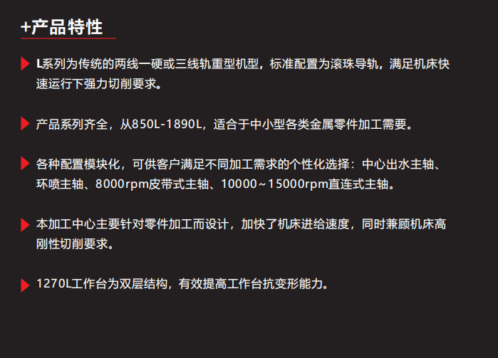 L系列整機以快速剛性加工為基本設計出發(fā)點,為零部件量產、加工精度、加工效率最大化提供保證;高效排屑、快速進給及主軸高速功能的組合模塊化,滿足客戶不同加工需求的個性化選擇;影響整機品質的關鍵部件采用進口優(yōu)質配件。