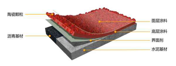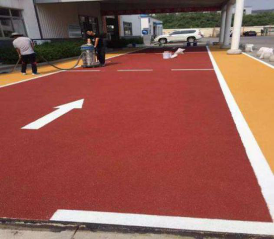 施工工藝: A.鋪裝于水泥或瀝青路面基礎(chǔ) B.吹風機或掃把清理基礎(chǔ)道路 C.滾涂底涂(瀝青路面不需要) D.刮涂攪拌均勻的MMA材料 E.均勻拋沙彩色防滑陶瓷顆粒骨料 F.清掃多余防滑骨料回收干凈 G.噴涂或滾涂罩面層